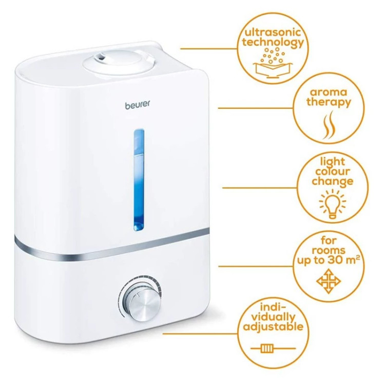 رطوبت نقش بزرگی در هوای محیط بازی می کند. معمولا سطح رطوبت هوا پایین است، مخصوصا در ماه های سرد سال. دستگاه بخور و رطوبت ساز بیورر LB 45 با کمک فناورری ultrasonic atomisation به شما کمک می کند تا رطوبت هوای خانه و یا محیط کار خود را متعادل نگاه دارید. این دستگاه با مخزن 4 لیتری خود، توانایی تولید رطوبت قابل تنظیم با خروجی 300 میلیلیتر در ساعت و پوشش محیطی به بزرگی 30 متر مربع را داراست. میزان خروجی بخار دستگاه قابل تنظیم می باشد و همچنین دو نازل این دستگاه توانایی چرخش 360 درجه را دارند.LB 45 عملکردی سایلنت و بی صدا دارد و شما به راحتی می توانید از آن در اتاق خواب خود و یا اتاق کودک استفاده کنید. همچنین شما میتوانید از روغن های خوشبو کنندهی آروماتیک برای ایجاد بویی مطبوع توسط این دستگاه در محیط خود استفاده کنید. دستگاه بخور و رطوبت ساز Beurer LB 45 مجهز به فیلتر ضد آهک است. سطح آب دستگاه از بیرون دستگاه قابل مشاهده است و دستگاه در صورت اتمام آب به صورت اتوماتیک خاموش خواهد شد.